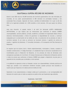 La Coordinadora Nacional para la Reducción de Desastres (CONRED) anunció que el país había superado la cifra de mil 300 siniestros a nivel nacional, por lo que el pasado 2 de abril la institución se declaró en Alerta Naranja Institucional.